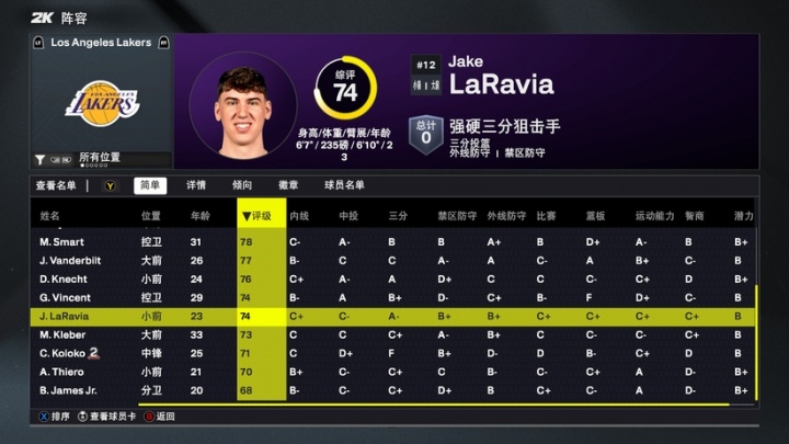 8月30日,NBA2K26正式公布各队球员能力值,湖人队评分详情如下: